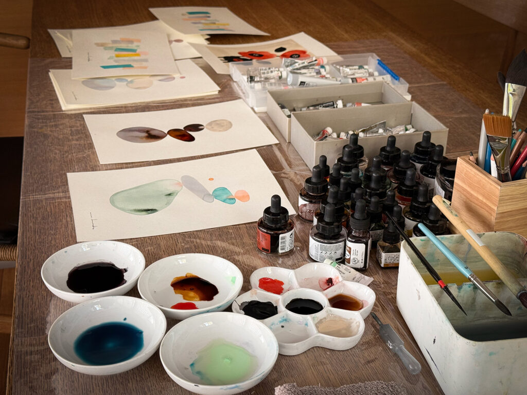 小さい頃、母親が飲んでいたコーヒーにミルクが混ざり切らずふわ~っと渦巻く様子を見て「綺麗〜」 と感じたのが始めだったのかもしれません。 それと同じように絵の具が滲んでいく感じが好きで、色の揺らぎが表現できる水彩に惹かれていきました。